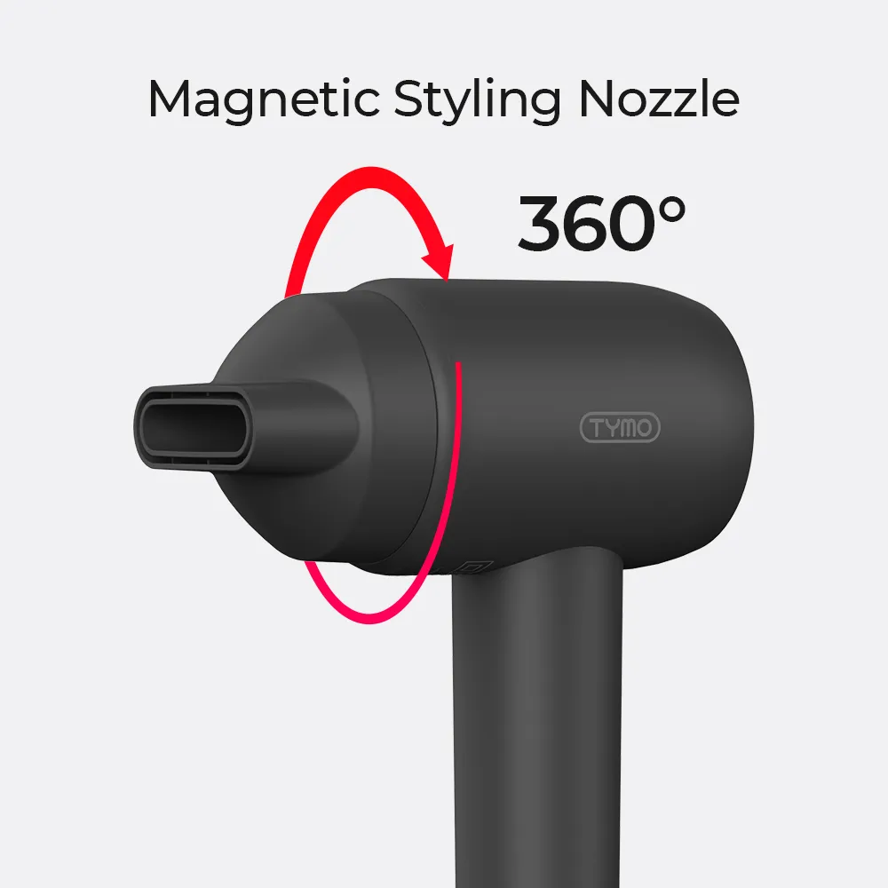 Attachments for the TYMO AIRHYPE COMPACT, including the magnetic nozzle, securely attach magnetically to prevent slipping during use. This magnetic design provides added convenience, similar to other high-quality hair dryer attachments on the market.