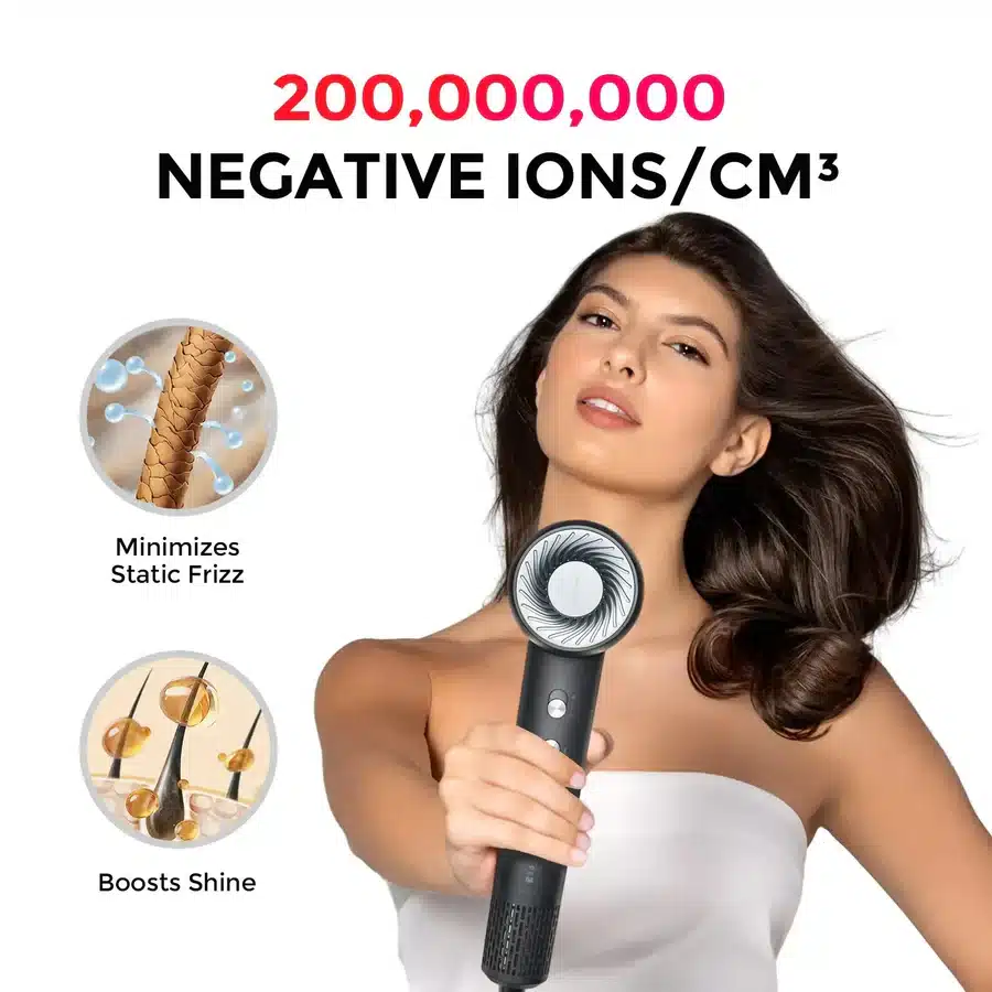 Achieve salon-soft hair in minutes with our powerful 110,000 RPM brushless motor and 20L/s airflow. Say goodbye to heat damage with smart temperature control and 200 million negative ions for a smooth, shiny finish. This lightweight, ultra-quiet dryer is perfect for travel. Enjoy hassle-free styling with safety assured.
